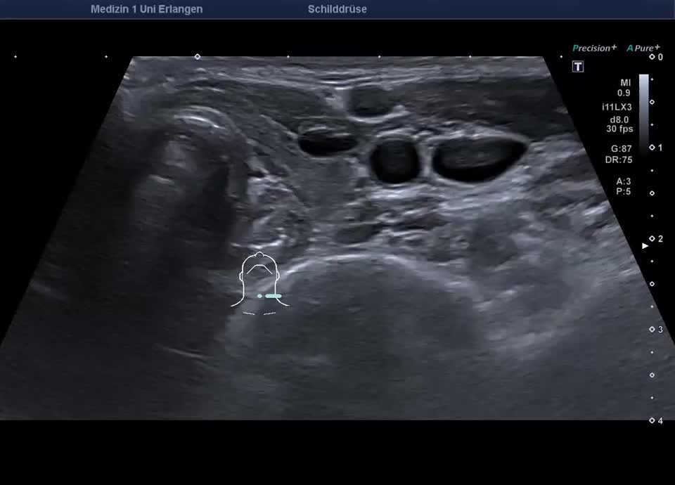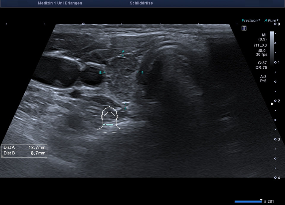 Deutlich verkleinerte Schilddrüse (umrandeter Bereich) bei chronisch lymphozytärer Thyreoiditis Hashimoto im atrophen Endstadium