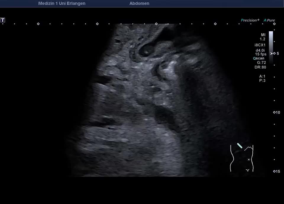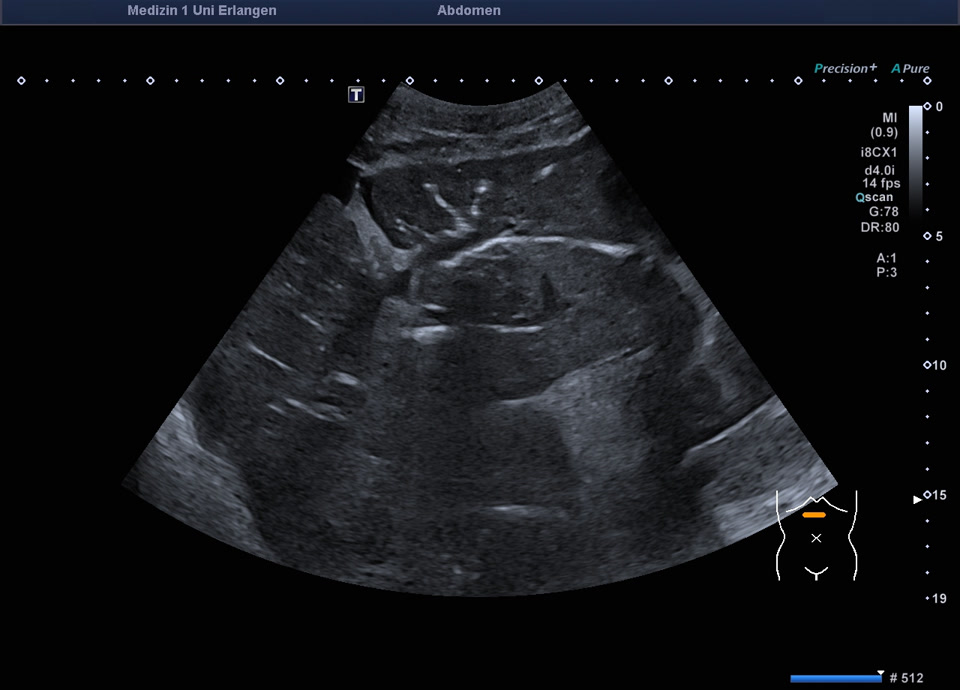 71-jähriger Patient mit Z.n. Duodenalkarzinom und Tumorresektion mit Duodeno-Jejunostomie. Circa ein Jahr nach Resektion zeigt sich im Ultraschall eine intra- und extrahepatische Cholestase mit Cholangitis. In der ERCP zeigt sich ein Tumorrezidiv mit exophytisch wachsender Tumorstruktur in der Papillenregion, die Sondierung der Papille gelingt nicht. Am Folgetag wird eine Choledochoduodenostomie mit Einbringung eines Lumen-Apposing Metal Stent (LAMS) endosonographisch durchgeführt. Hierbei entleert sich reichlich trübe Galle. Die Folgeuntersuchung nach drei Tagen zeigt eine Aerobilie (-> somit Beweis der korrekten Lage des Stents).