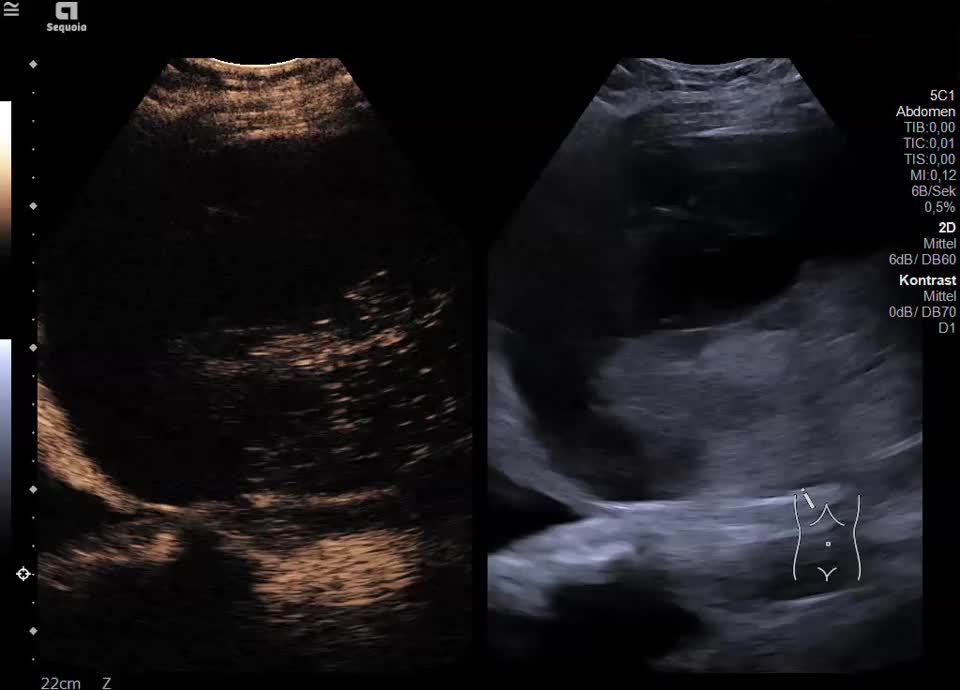 Kasuistik: die 48-jährige Patientin hat während ihrer Schwangerschaft ein HELLP-Syndrom entwickelt.  Zustand nach Sectio bei schwerer Präeklampsie und Gemini in der 37. SSW. Post-partales HELLP mit Leberhämatom und beginnendem Leber- und Nierenversagen. Durch die Interventionelle Radiologie erfolgte die CT-gestütze Embolisation mit Coils. Sonographisch stellt sich jetzt ein 12x13cm messendes subkapsuläres Hämatom im rechten Leperlappen mit Anzeichen einer beginnenden Organisation dar. Die Läsion nimmt kein Kontrastmittel auf, eine aktive Blutung kann ausgeschlosen werden.