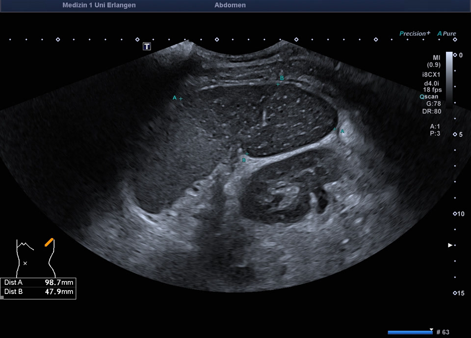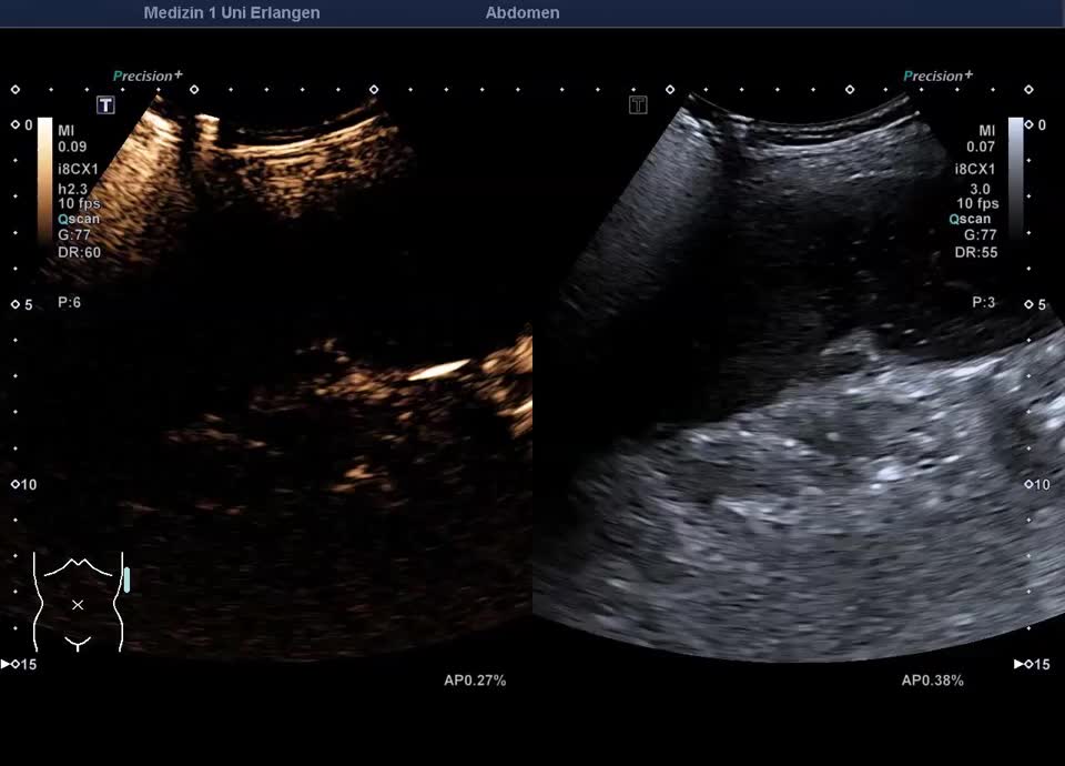Epikrise: 19-jährige Patientin mit einem schweren angeborenen Herzfehler berichtet über plötzlich aufgetretene starke Schmerzen in der linken Flanke vor 14 Tagen. Sonographisch zeigt sich die Milz regelrecht lokalisiert, mit einem ausgedehnten Milzinfarkt der unteren Milzhälfte. Weder im Farbdoppler, noch im CEUS, lässt sich eine Restperfusion der unteren Milzhälfte feststellen. Therapeutisch wird eine Antikoagualtion begonnen und eine Verlaufskontrolle in 4 Wochen veranlasst.
