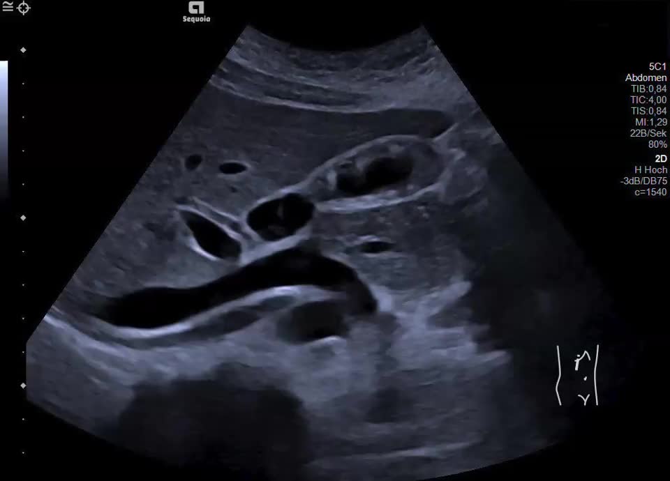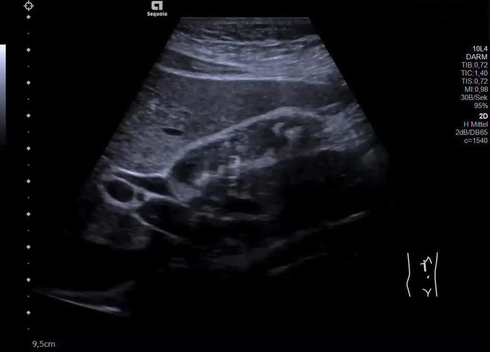 16-jährige Patientin berichtet seit mehreren Monaten über rezidivierende Durchfälle und Bauchschmerzen im Bereich der rechten Colonflexur, zuletzt etwa alle 14 Tage. Vor zwei Monaten wurde sie nach einer besonders starken Episode in die Klinik überwiesen; Labor unauffällig. Zum Zeitpunkt der letzten Untersuchung beschwerdefrei. Sonographisch zeigt sich eine Wandverdickung der Gallenblase mit inhomogener Schichtung bei erhaltener, glatter Innen- und Außenkontur. Betroffen sind vor allem Fundus und Corpus, das Infundibulum erscheint unauffällig. In den verdickten Wandabschnitten finden sich hyperechogene Einzelechos mit Reverberationsartefakten (Kometenschweifartefakte). Zusätzlich zeigen sich in der Hochfrequenzsonografie (Video) echofreie, kleinzystische Areale in der Wand, die den erweiterten Rokitansky-Aschoff Sinus entsprechen. Charakteristischer Befund einer segmentalen Gallenblasenadenomyomatose.