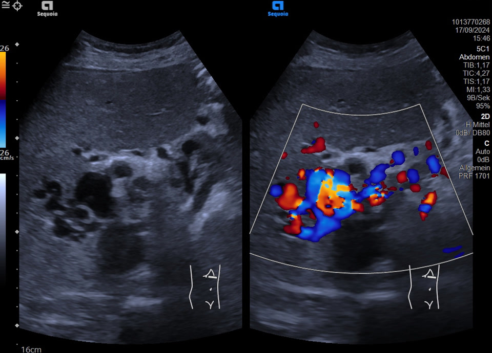 Ultraschall, Ultraschallatlas, Ultraschallbilder, Ultraschallvideos, Sonographie, Sonographieatlas, Sonographiebilder, Sonographievideos, Kontrastmittelultraschall, Kontrastmittelsonographie, Medizinische Klinik 1, Uniklinik, Universitätsklinikum, Erlangenm proximalen Hilus (meist ist hier die A. hepatica zwischen DHC und Pfortader zu finden)