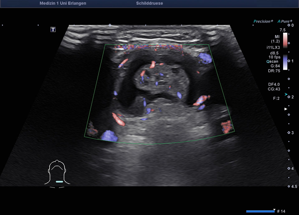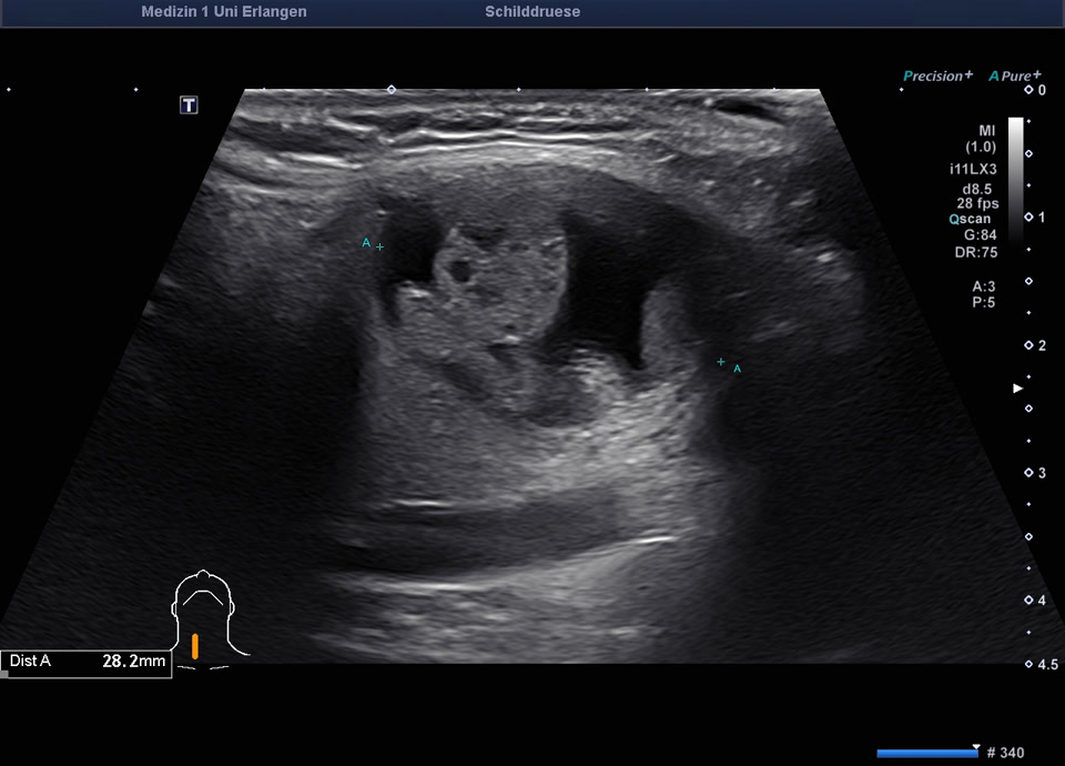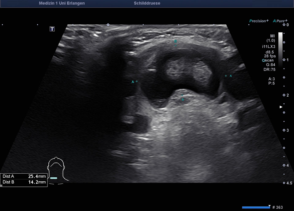 Keine Knoten | Zyste, spongiformer Knoten | Oval, glatt begrenzt, echogleich oder echoreicher (im Vergleich zur SD), keine sonographisch suspekte Merkmale | Oval, glatt begrenz, etwas echoärmer (im Vergleich SD), keine sonographisch suspekten Merkmale | Mindestens eins dieser suspekten Merkmale: