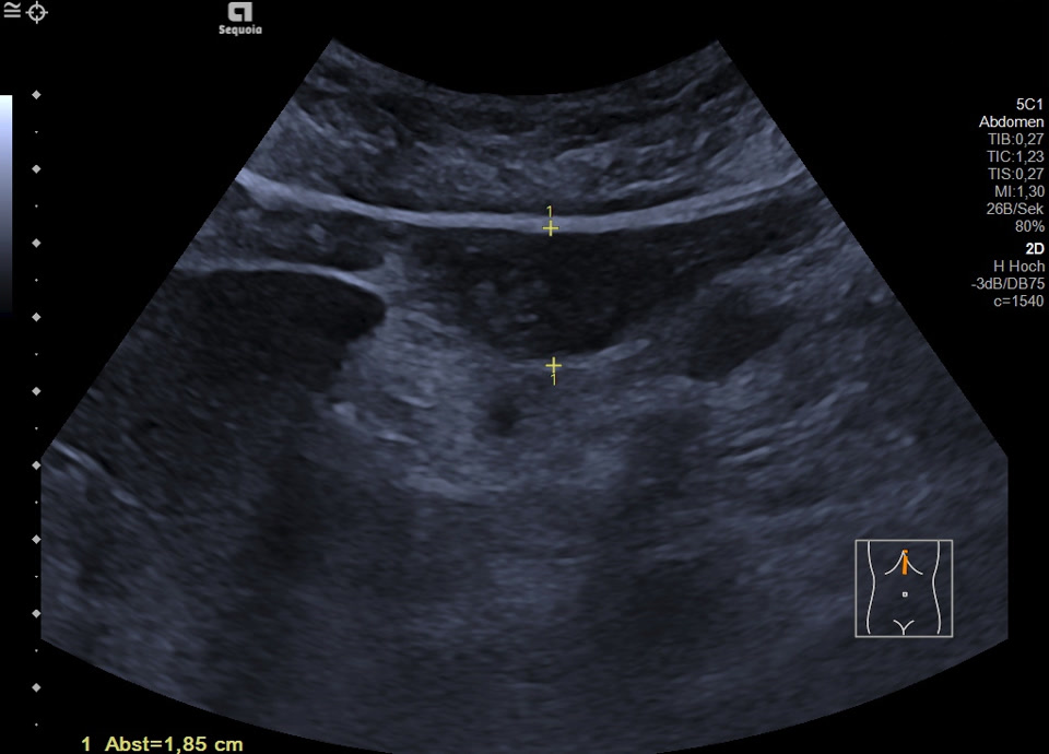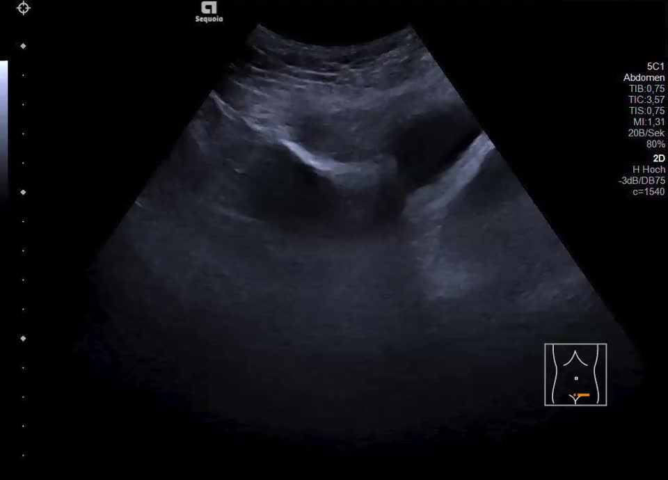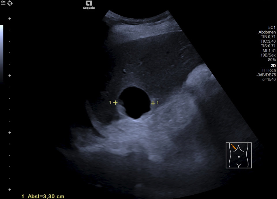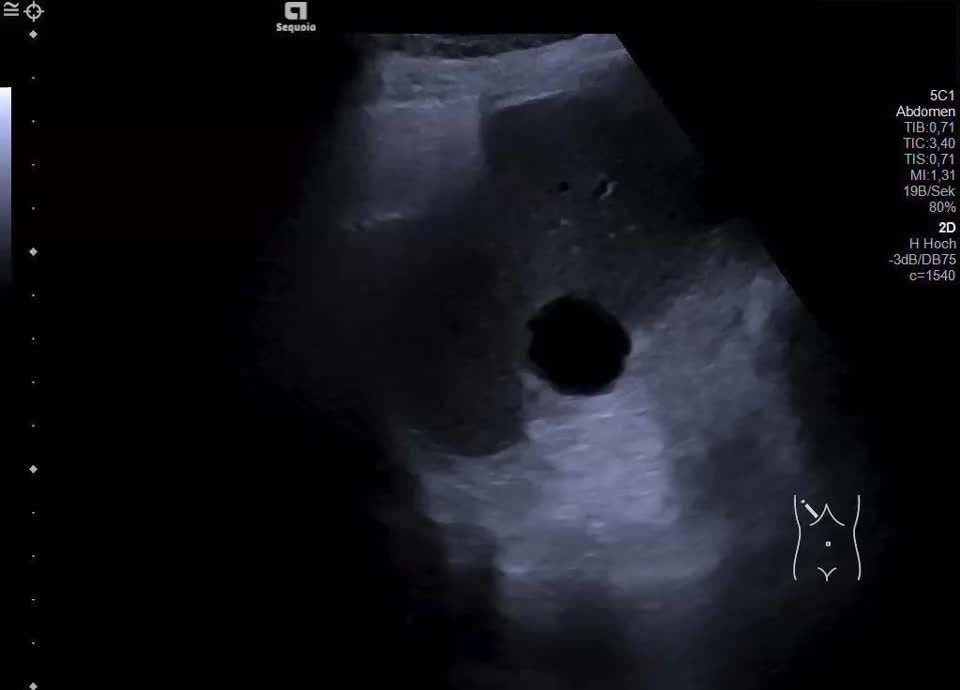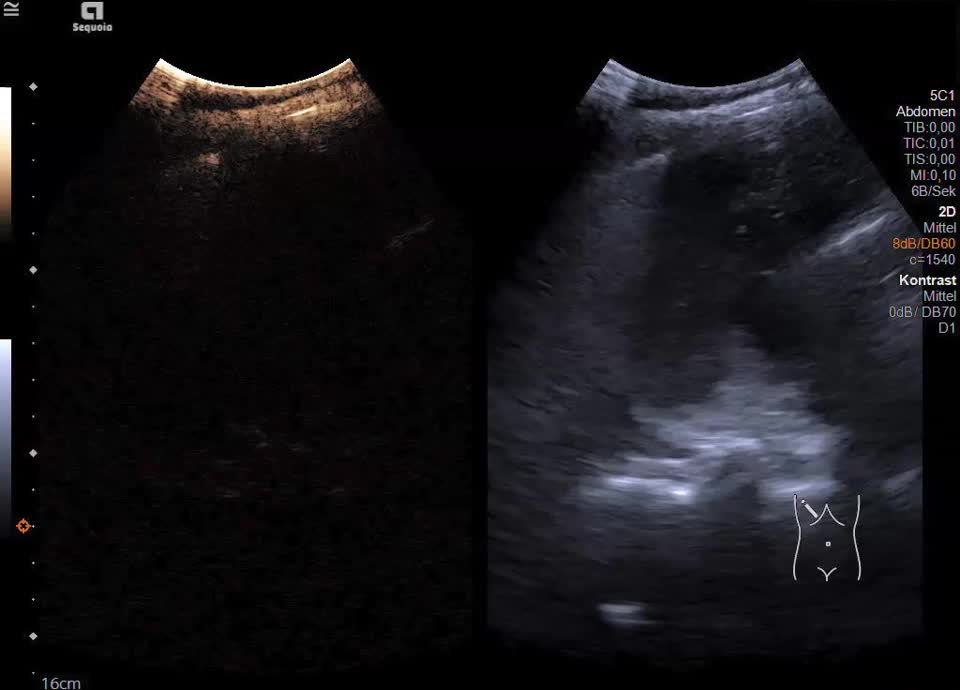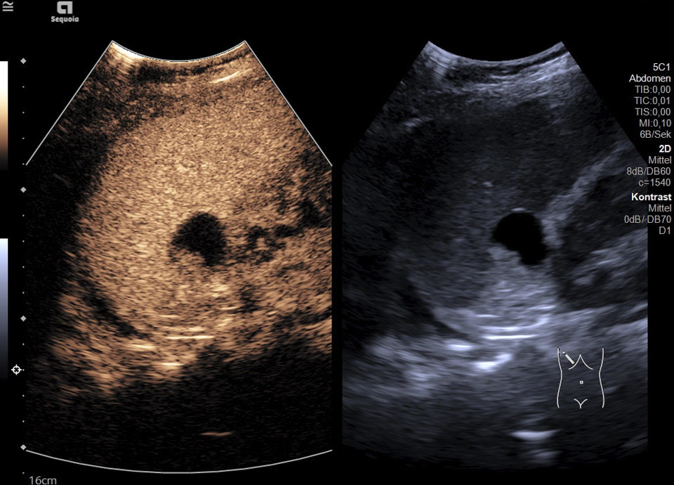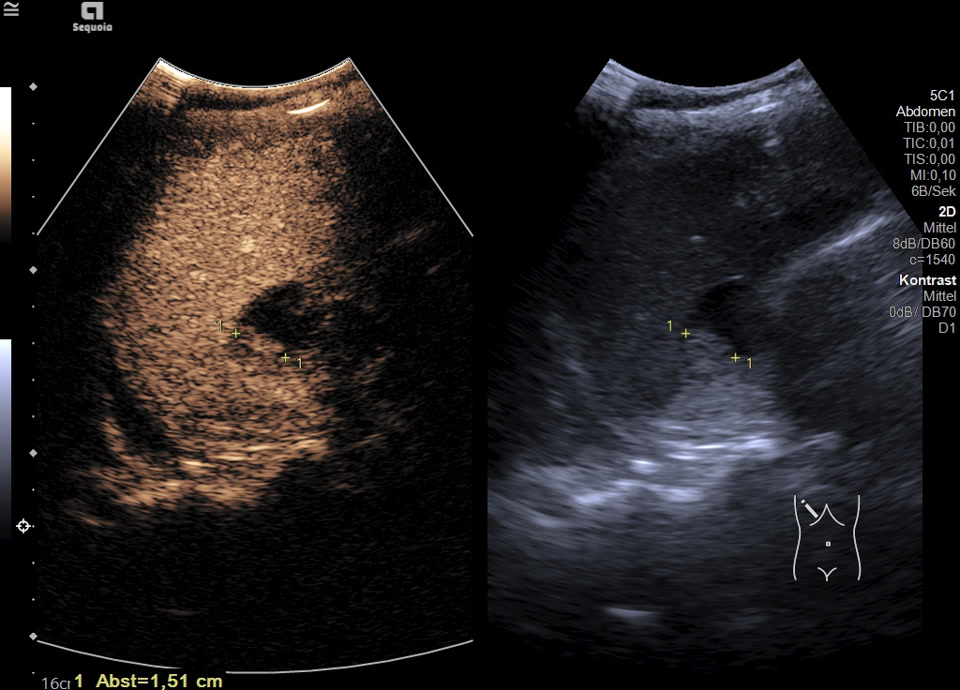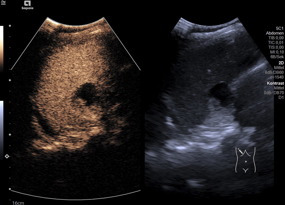 Es zeigt sich subkapsulär in Segment VI der Leber eine zystische Raumforderung mit durchgehendem Kapselreflex und hyperechogenem solidem Anteil. Der Befund ist nicht vereinbar mit einer blanden Zyste, sondern suspekt auf eine zystisch-solide Metastase. In der ergänzenden CEUS nehmen die soliden Anteile in der arteriellen Phase Kontrastmittel auf und zeigen in den portalvenösen sowie späten Phasen eine persistierende KM-Anreicherung ohne Washout. Zusätzlich finden sich eine noduläre Peritonealverdickung im Oberbauch sowie ein zystischer Ovarialtumor mit soliden Anteilen im rechten Unterbauch. In Zusammenschau der Befunde besteht der dringende Verdacht auf ein hepatisch und peritoneal metastasierendes Ovarialkarzinom.