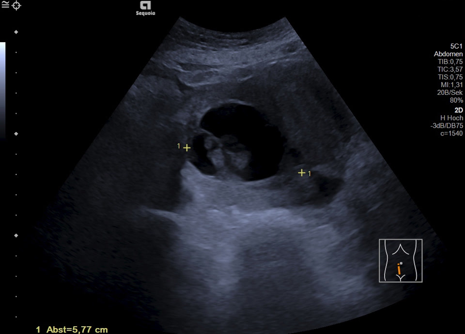 Kasuistik: 61-jährige Patientin mit V.a. Antiphospholipid-Syndrom, Z. n. multiplen Hirninfarkten und Lungenarterienembolie unklarer Genese sowie CT-morphologisch unklarer ovarieller Raumforderung. Es erfolgt eine sonographische Abklärung des Abdomens.